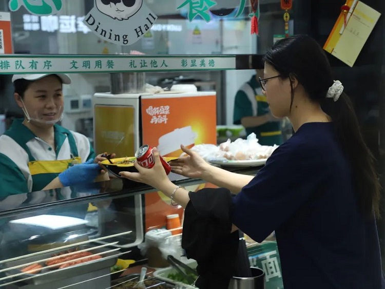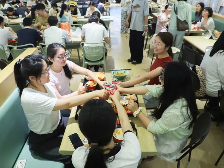 后勤老师和康捷工作人员共同为学生送毕业餐