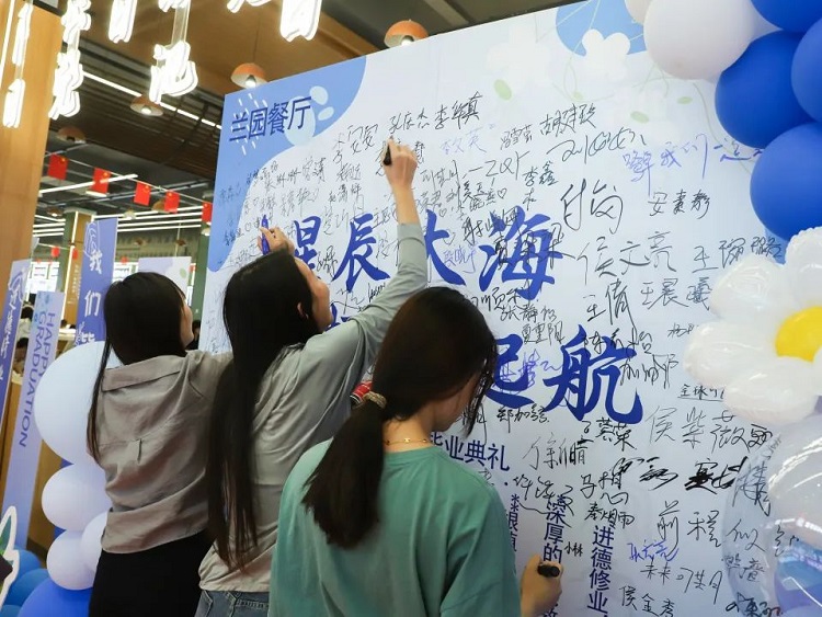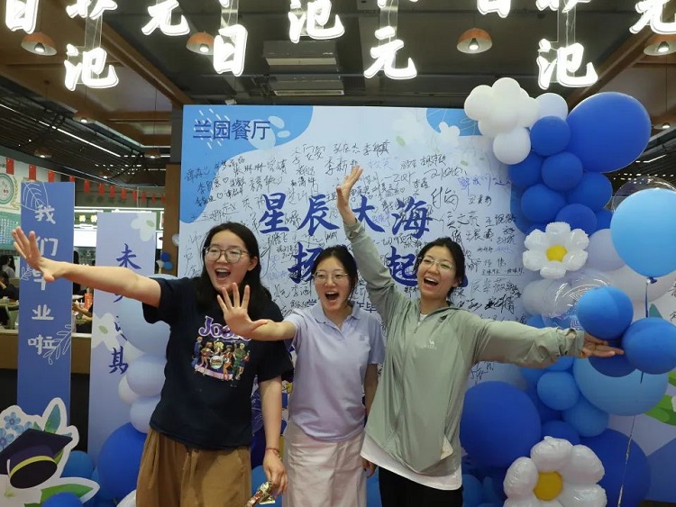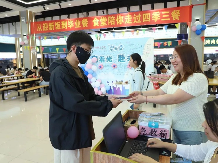 “商工毕业季,青春午餐会”商丘工学院东苑餐厅一楼在餐厅门口布置了毕业生纪念留影墙,设置了毕业生专用窗口,准备了丰富多样的水果……用美食为学子的大学时光画上圆满的句号。
